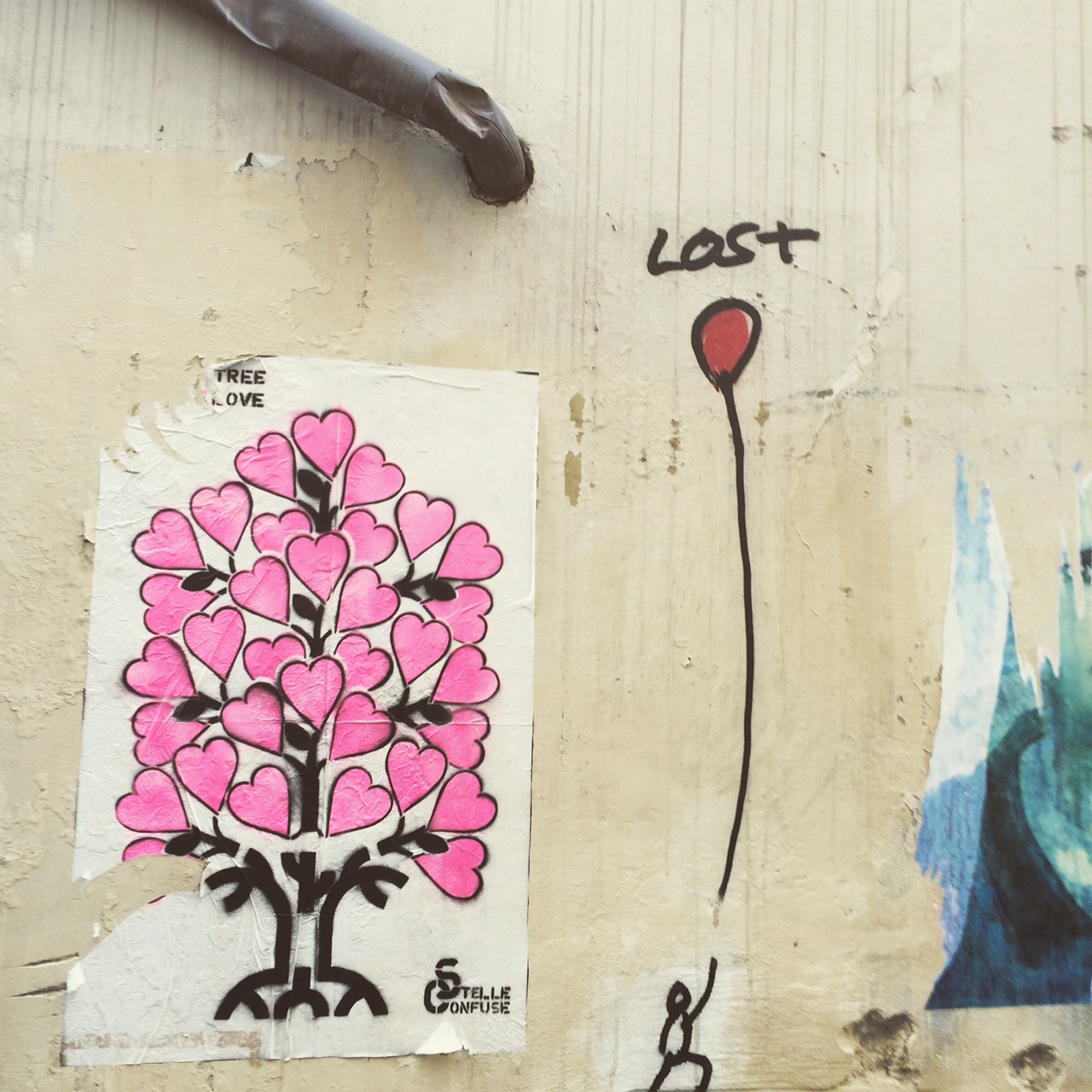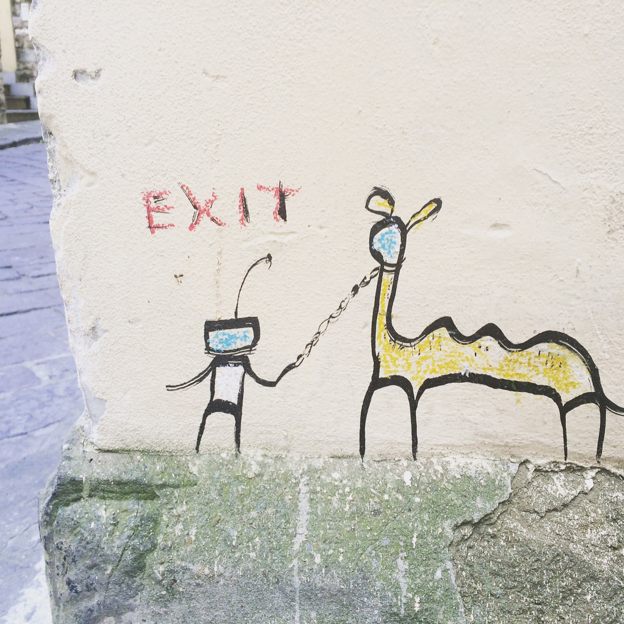 Licht und Markt aus New York, die meisten Graffitis sind aus Florenz, aber: der Graffiti-Vogel aus Venedig, das schöne große bunte Graffiti, was aussieht wie ein Tier – aus Gießen und das kleine Monster auf der Ampel aus Mainz.