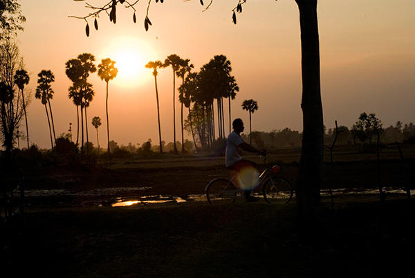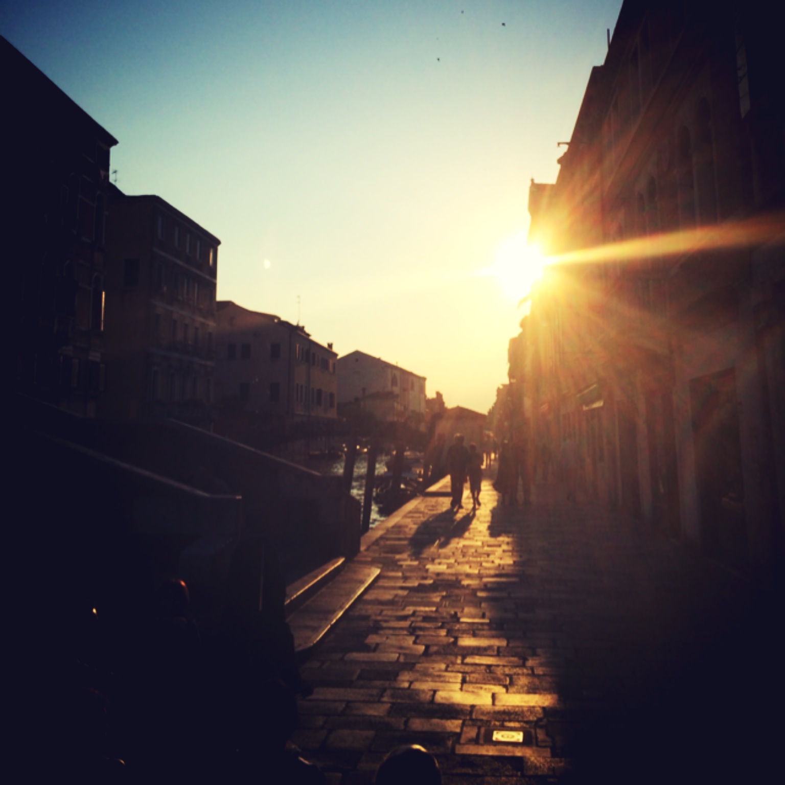 Der Sonnenuntergang mit Fahrradfahrer ist aus Kambodscha, der Sonnenuntergang neben der Wüste aus Florenz, dann gibt es noch einen Sonnenuntergang aus Venedig – das mit den Kanälen. Das ist das Bild neben dem Graffiti. Entdeckt ihr es?