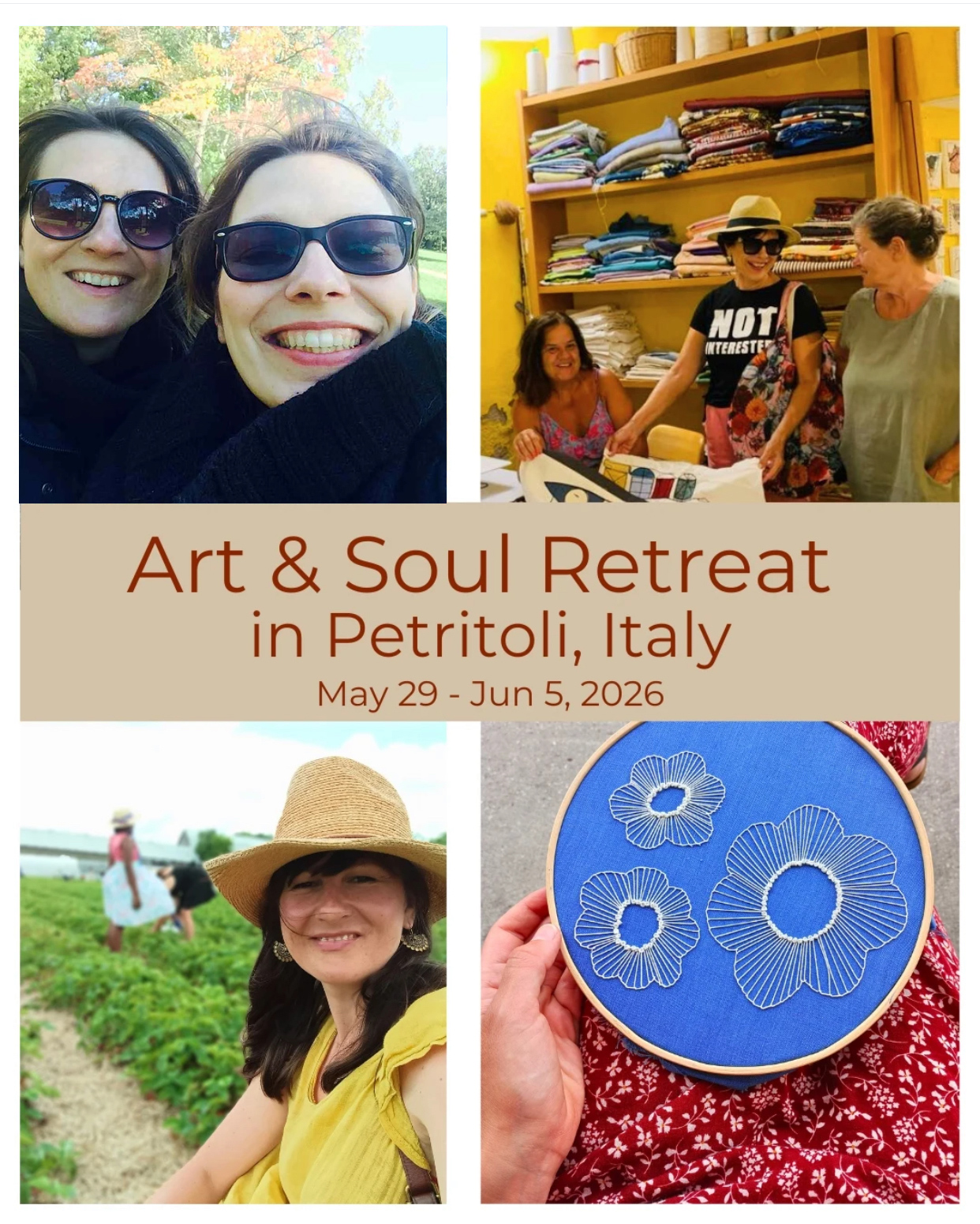 Together we’ll explore embroidery, journaling, and storytelling. Stroll the fairytale streets of Petritoli, pause for espresso and reflection, hike to hidden waterfalls near Sarnano and stitch beneath ancient olive trees.